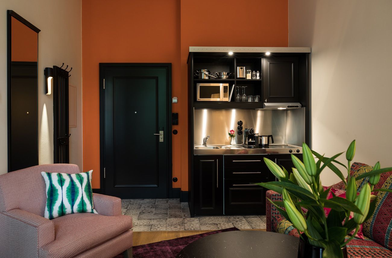 Electric stove, refrigerator, kettle, dishwasher, toaster, microwave, Nespresso coffee machine, cooking utensils.